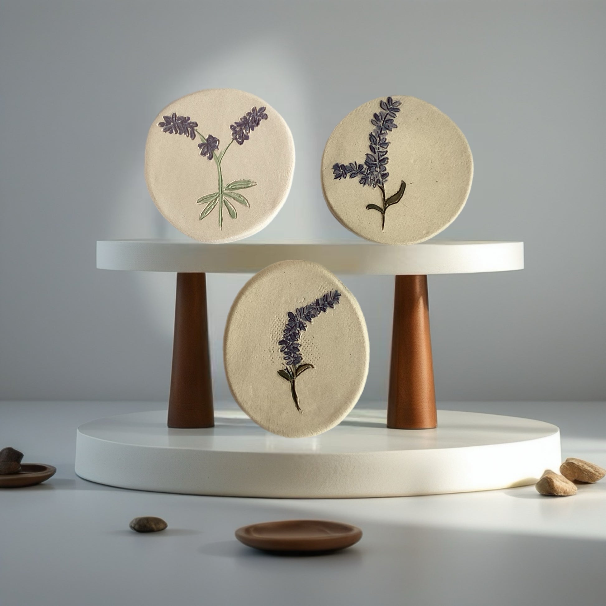 Local artisian individually hand crafted clay diffuser 2” diameter x 1/4” thick. Each diffuser with unique design.